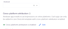 5. Once both apps have been selected, make sure that the Cross-platform attribution toggle is enabled. To do so, hit the “Edit” button and click on the “Enable cross-platform attribution” toggle for both iOS and Android apps.